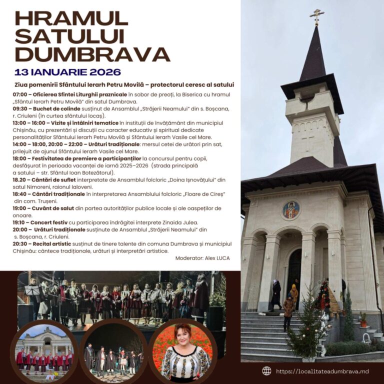 Anunțuri, Biserica Sf. Ierarh Petru Movilă, EVENIMENTE Dragi dumbrăveni și enoriași ai Bisericii ”Sf. Petru Movilă” din Dumbrava! Hramul satului Dumbrava va fi prăznuit pe 13 ianuarie, zi… 12 ianuarie 2026 13:18